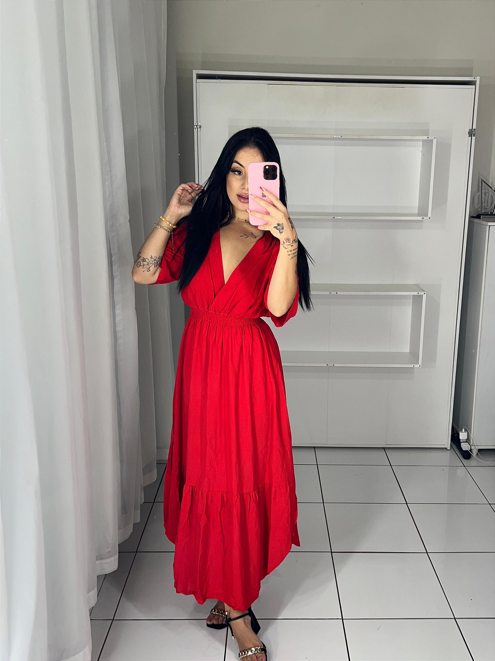 Descrição: vestido midi, decote em V, não possui bojo, lastex na cintura, possui forro.